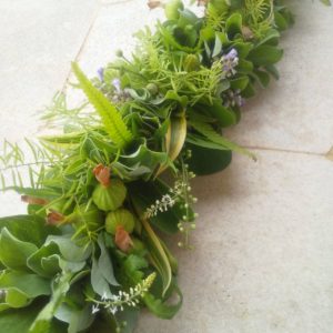数種類の葉を組み合わせて、麻紐で結び括りつけながら、50cm程度の長さのレイに仕上げていきます。